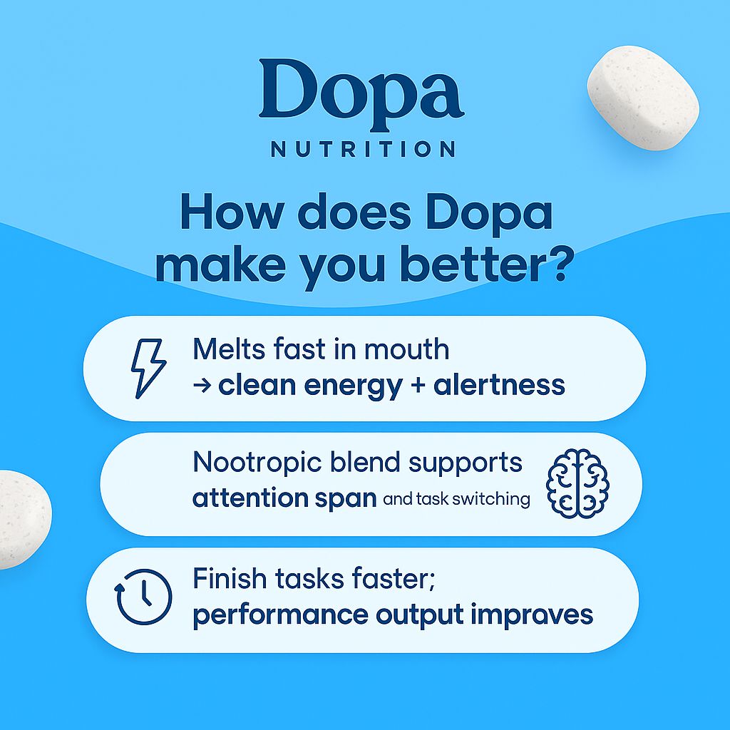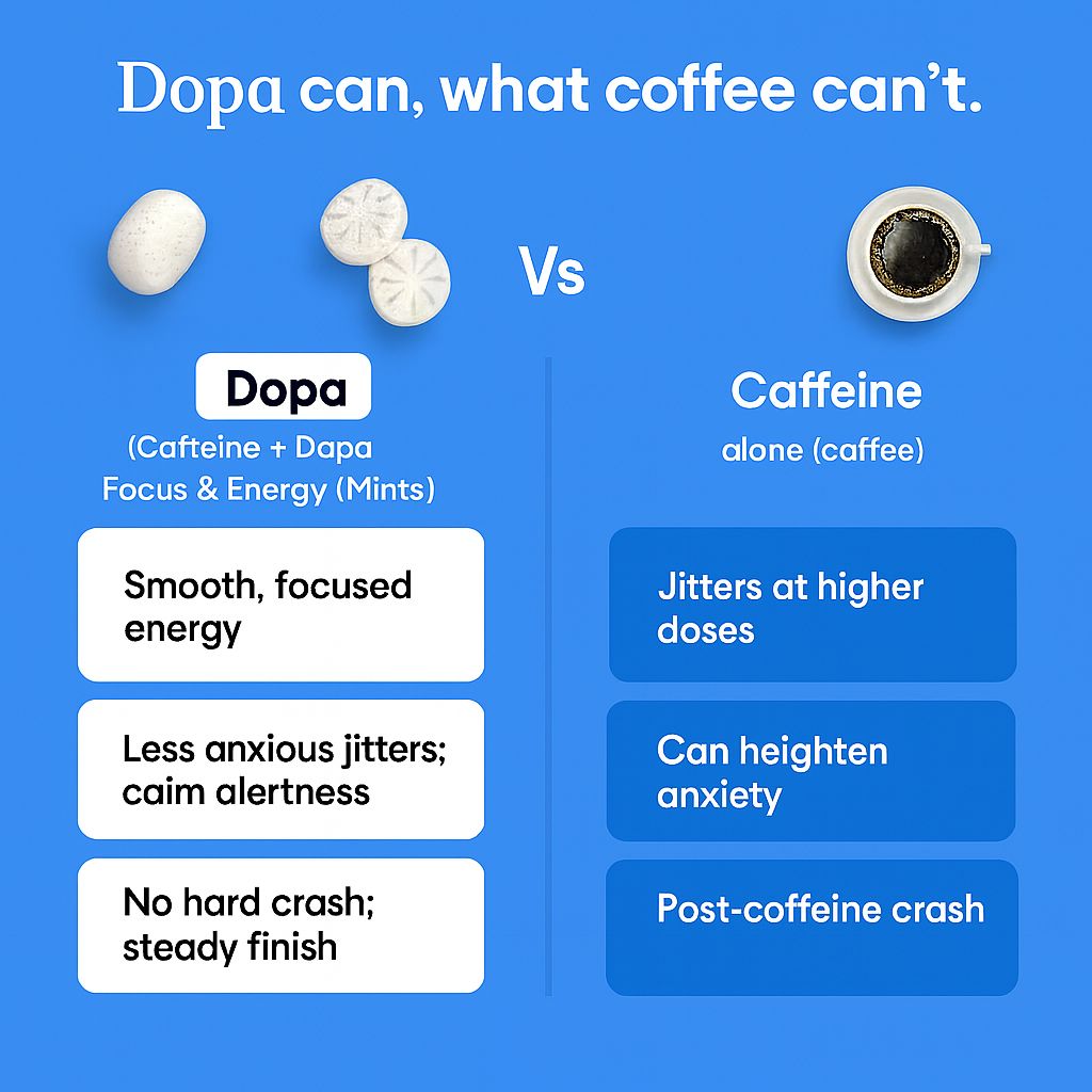 The caffeine provides rapid alertness while L-Theanine promotes calmness and reduces jitteriness — together they support sustained attention, clearer thinking, and better concentration.